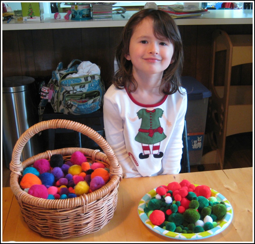 Gather fuzz balls and a four-year-old. Be sure you shove your hand in a basket full of fuzz balls- it’s so nice! (Heh.) No really, they are soooo soft.