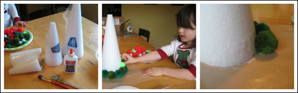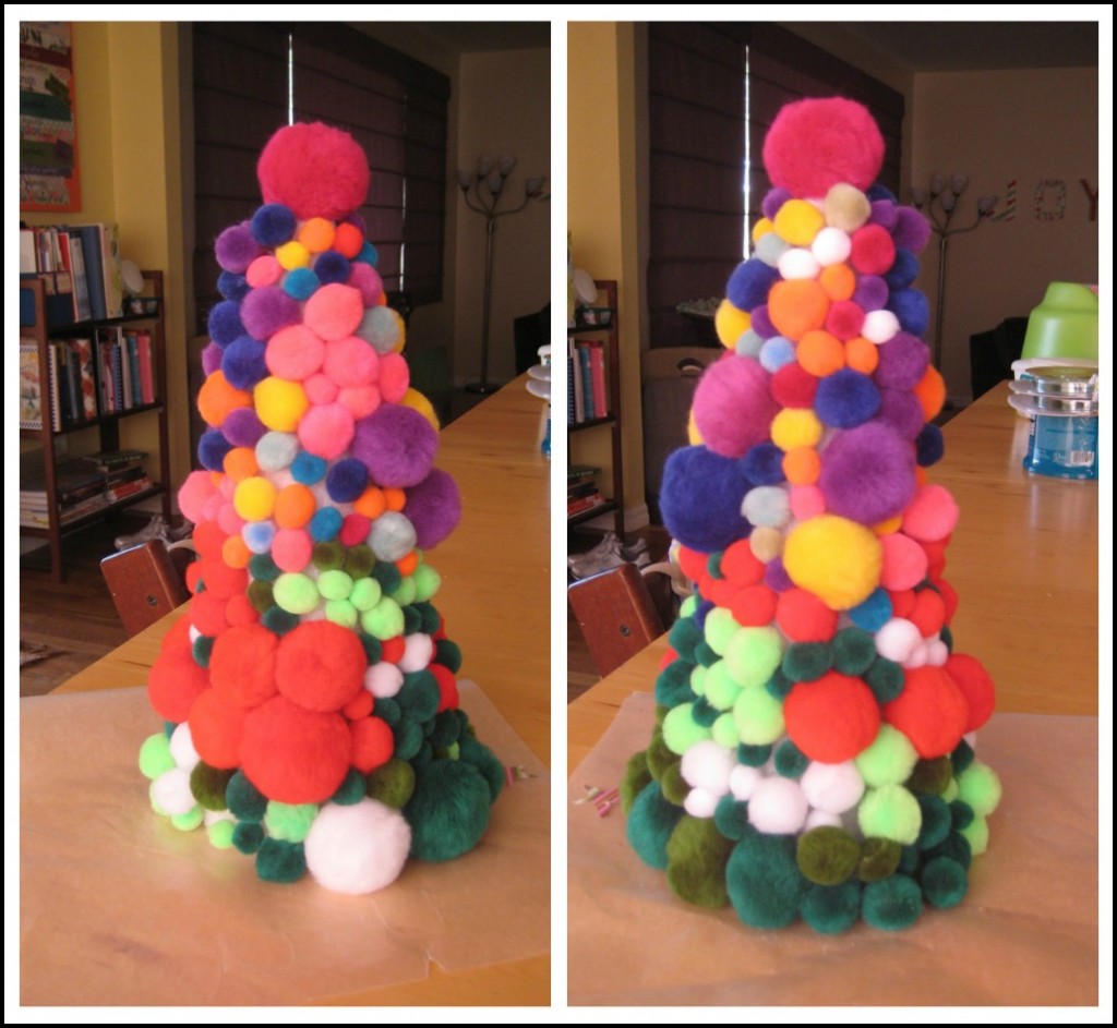 Here’s the problem: we ran out of Christmas colors. So instead of a cute, fuzzy Christmas tree we have a psychedelic fuzz ball mess. I also need to look into getting one size. This thing is a nightmare to look at. I kind of want to cry looking at it. The real kicker, though, is that Anna LOVES it. I don’t have the heart to get rid of it. I’m tempted to take all the fuzz balls off and start over. Who knows. At least Anna likes it. 🙂