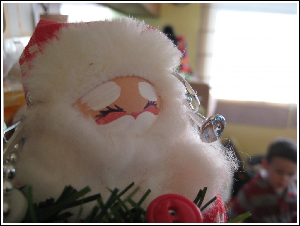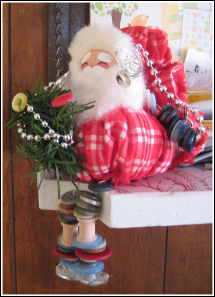 My aunt sent me this little guy several years ago and I still look forward to finding him a spot every year. This year he’s on our shelf in the kitchen. I love that his little legs dangle, all the buttons…