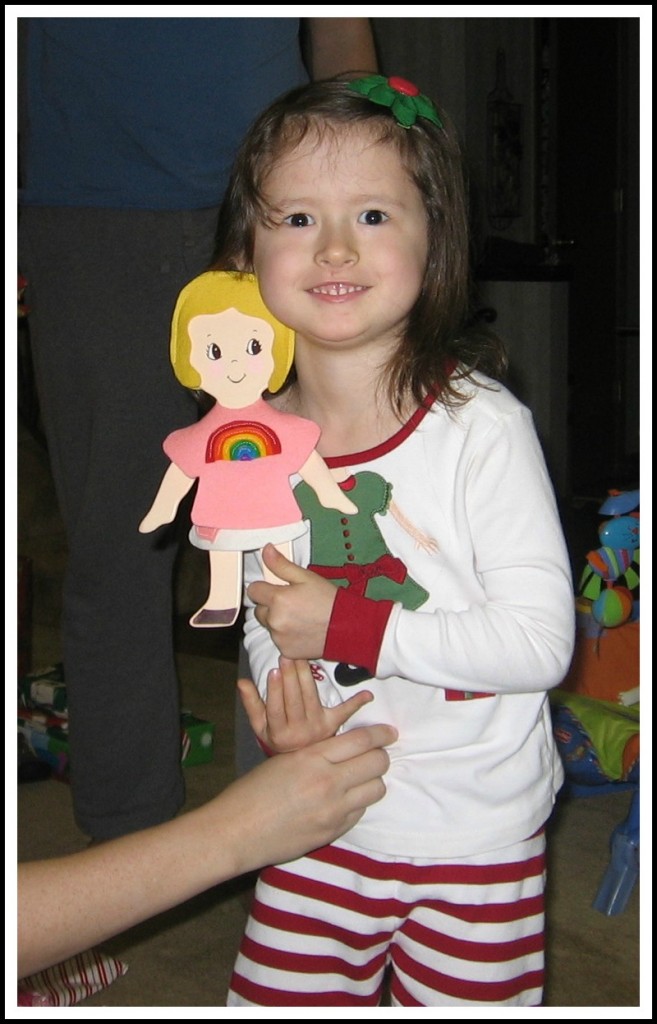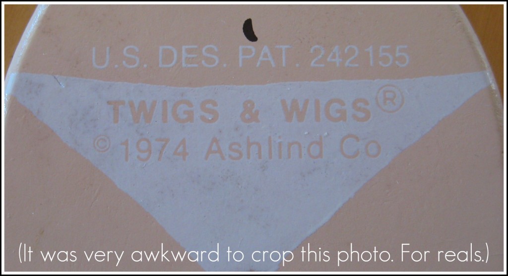 They are called “Twigs and Wigs” dolls, and after a little research I found that they are not made anymore, so I have officially dubbed them “cool retro dolls.” We had 3, perhaps because I am one of three {awesome} girls. My sisters and I wore them out! They came with felt clothes that were uber-easy to put on and take off, which is one reason we loved them so much. After a visit last winter where Anna played with the old, tired clothes, my mom and I decided to give them a new wardrobe and then give them to Anna at Christmas. We started during my parents’ visit in late-September, but I finished them up just before we left for Christmas. Before I go on, check it out- they even had a patent number and everything- aren’t they official?