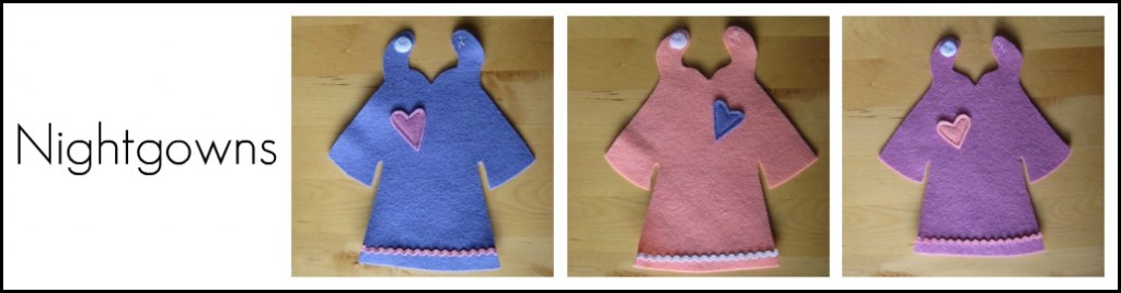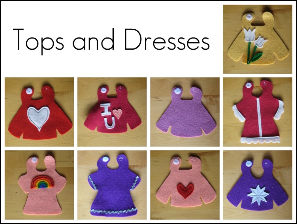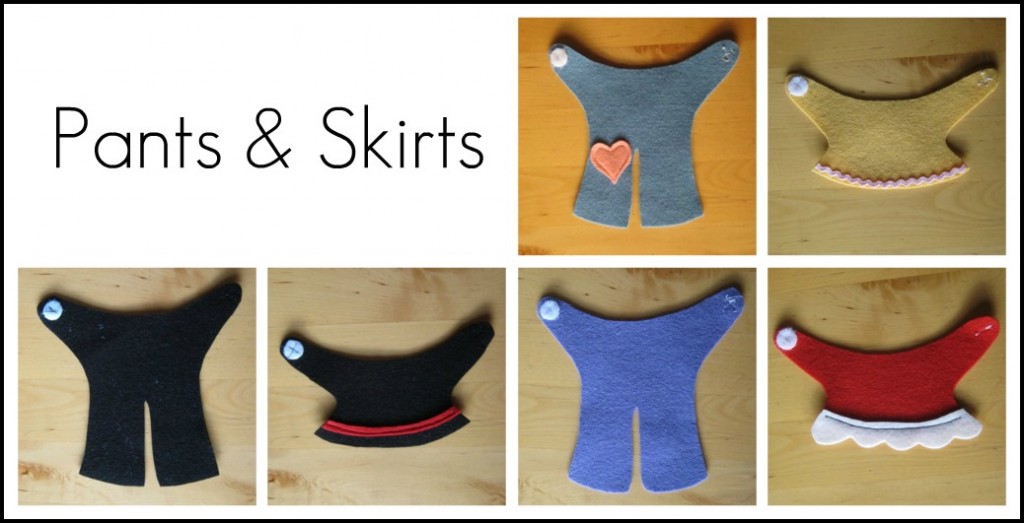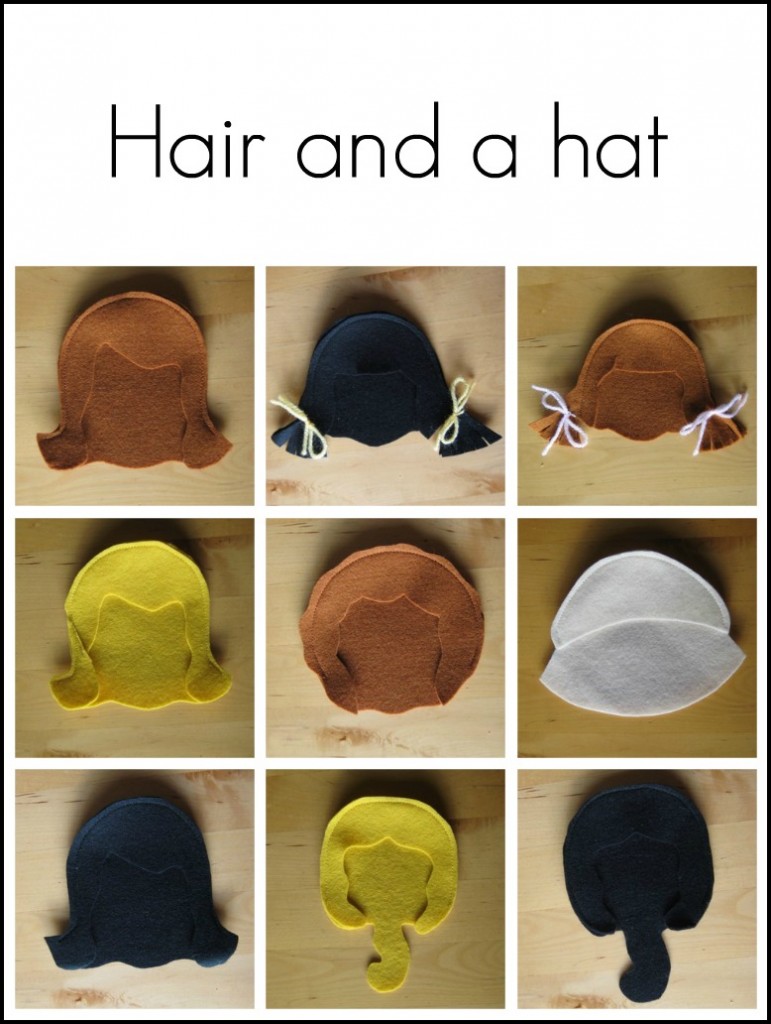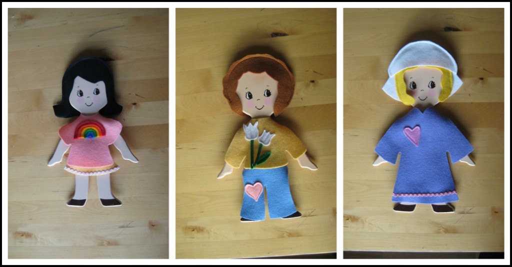 Felt is addictive. Not as addictive as Pinterest, but pretty addictive. It’s so easy to work with, sews nicely, and just feels yummy under your fingers. We used the old hair-do’s and clothes to make templates, but then I tried to add some new flare to the clothes. The following pictures are not everything we made, but a nice sampling: