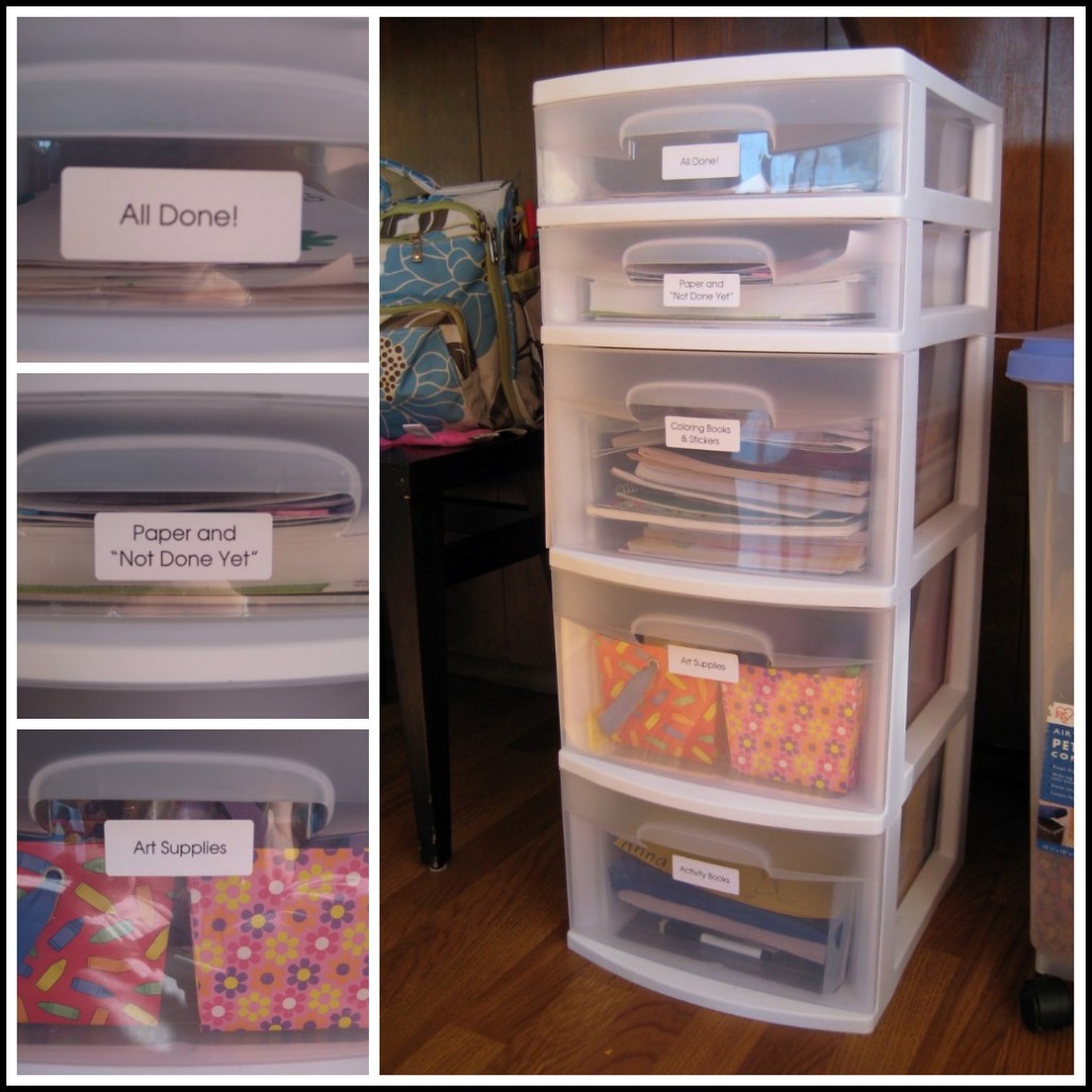 The kids can pull out a tub (Target $1 section- they always have these) of crayons or markers, take them to the table, and then put them away easily (in theory). Or, in reality, when it’s time for dinner, it doesn’t take me forever to get their crap out of the way. 😉