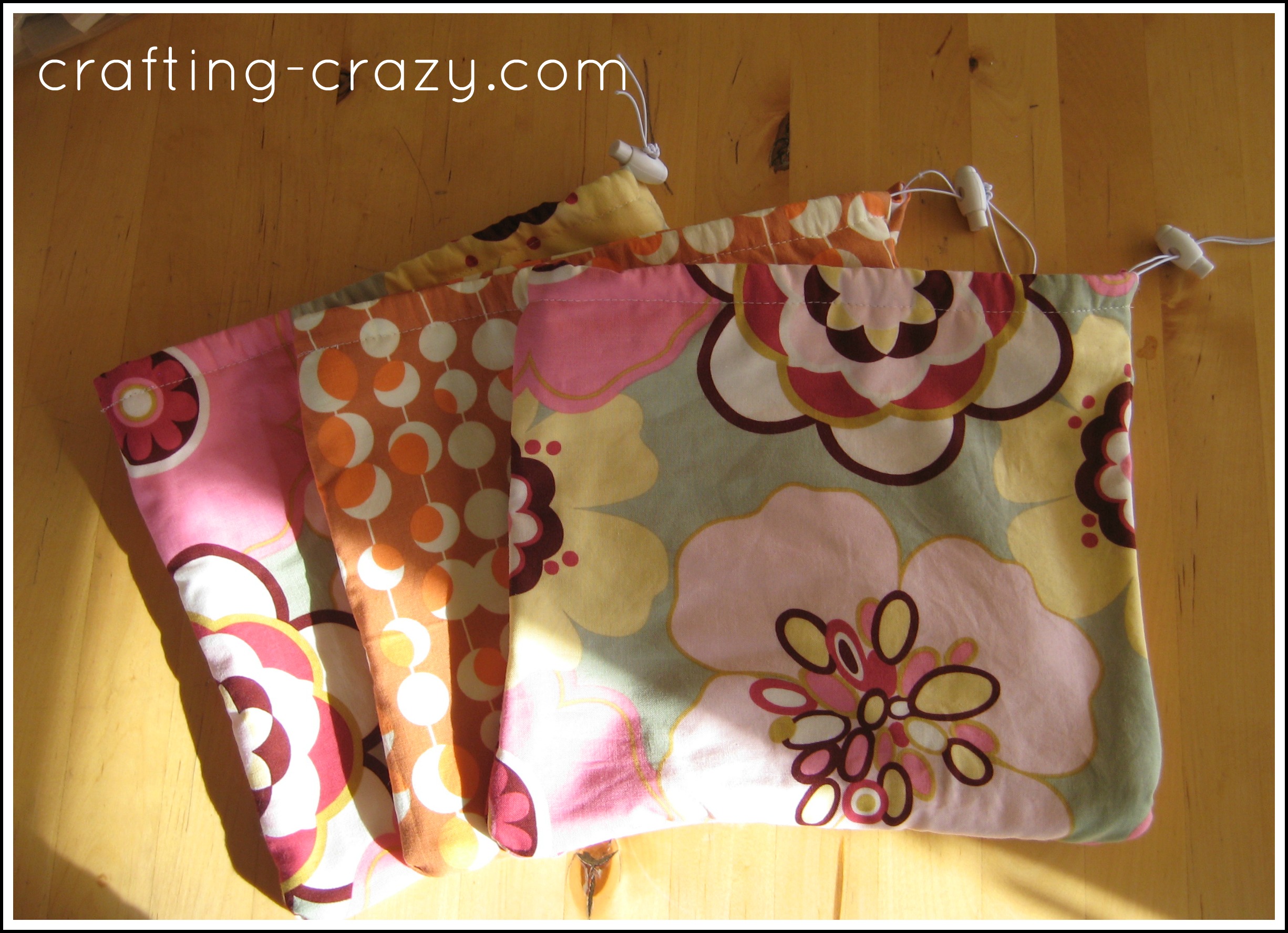 I knew just where to go for what I needed. My friend Kari’s blog, Handmade Mommy, has a lovely tutorial on fishing reel drawstring bags. I thought they’d be perfect for the kids because they are easy to open and shut, and you can make them whatever size you need. Here’s my final product: