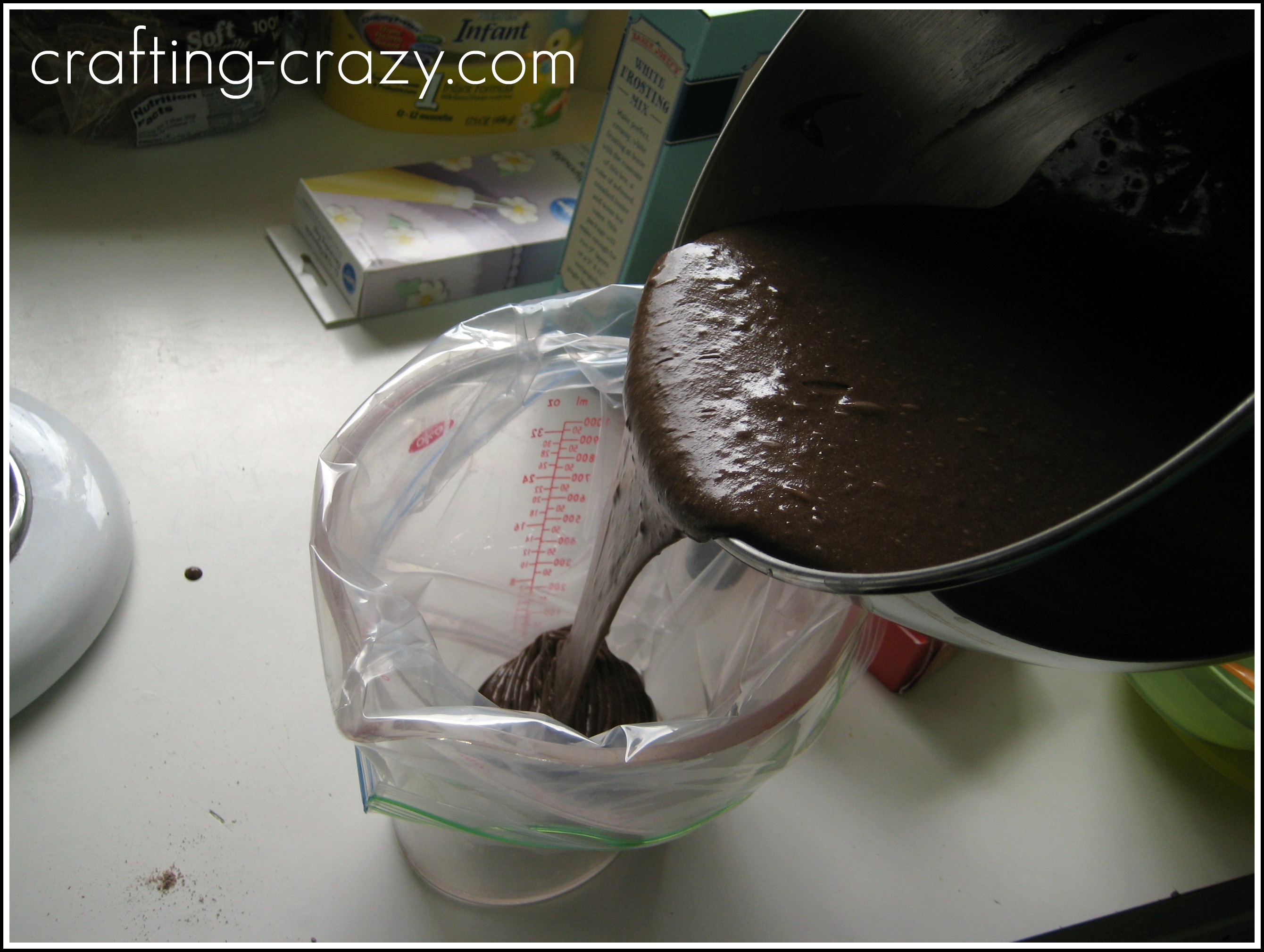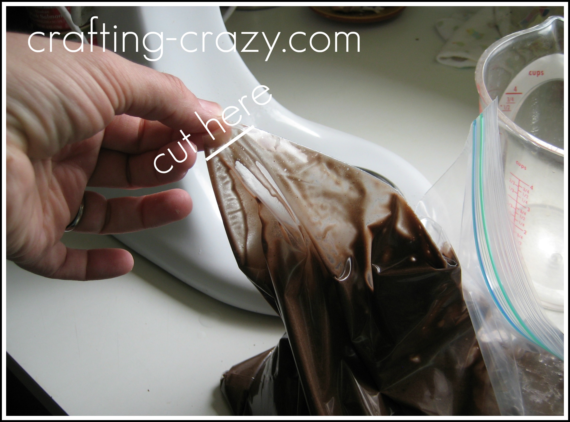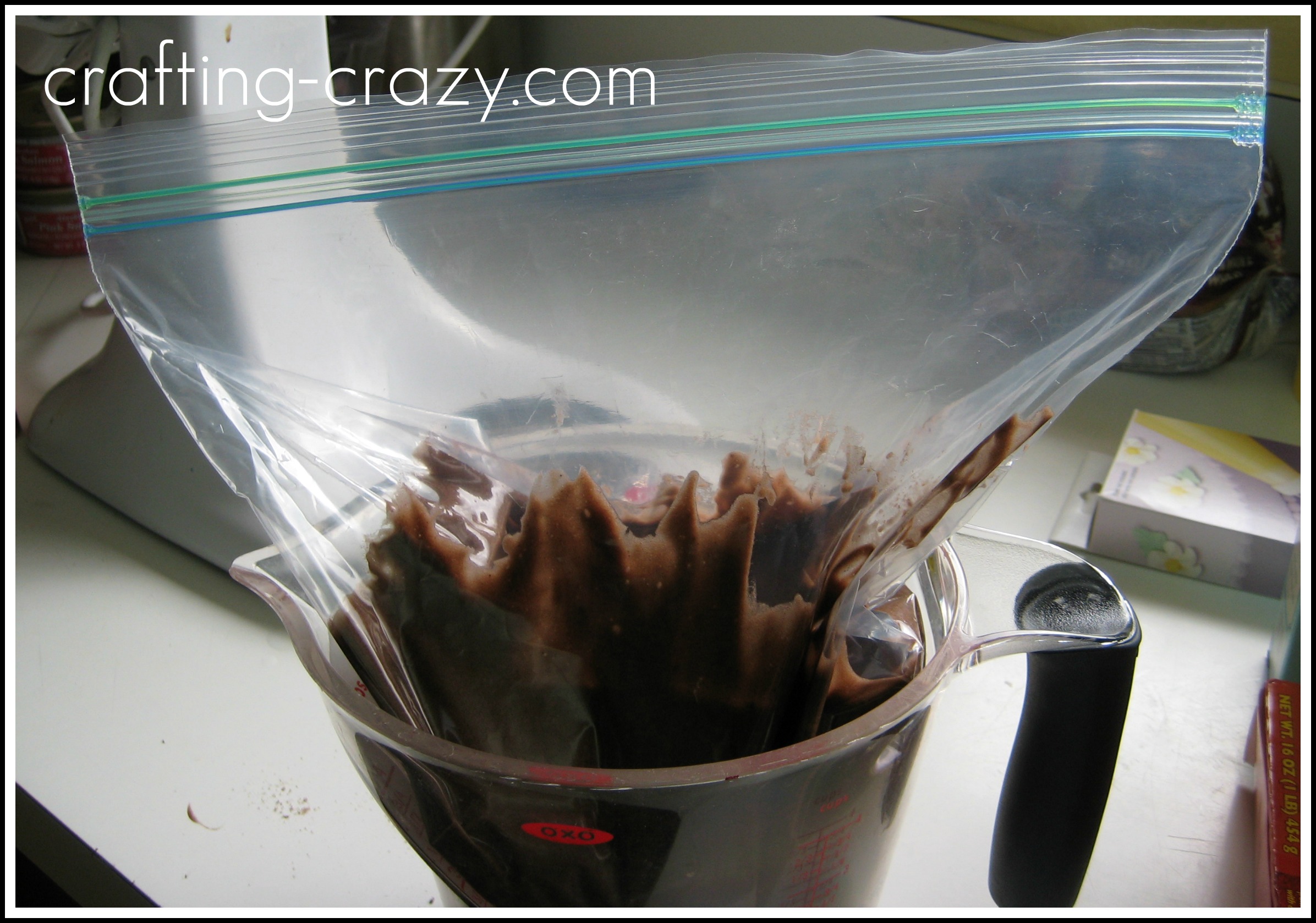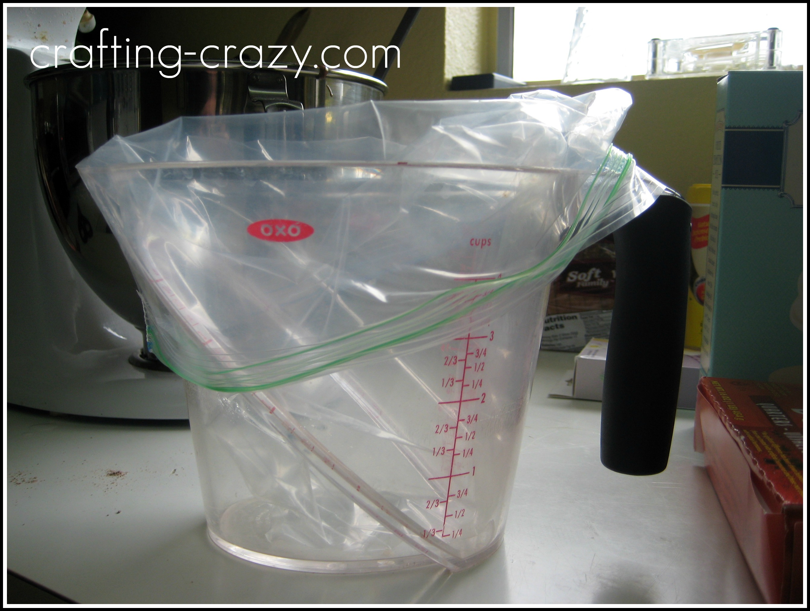 Line a 4-cup measure with a gallon food storage bag, preferably one with two layers of zips. You may have to use something else if your measuring cup is too wide. My cups are the “OXO” brand and it fit perfectly.