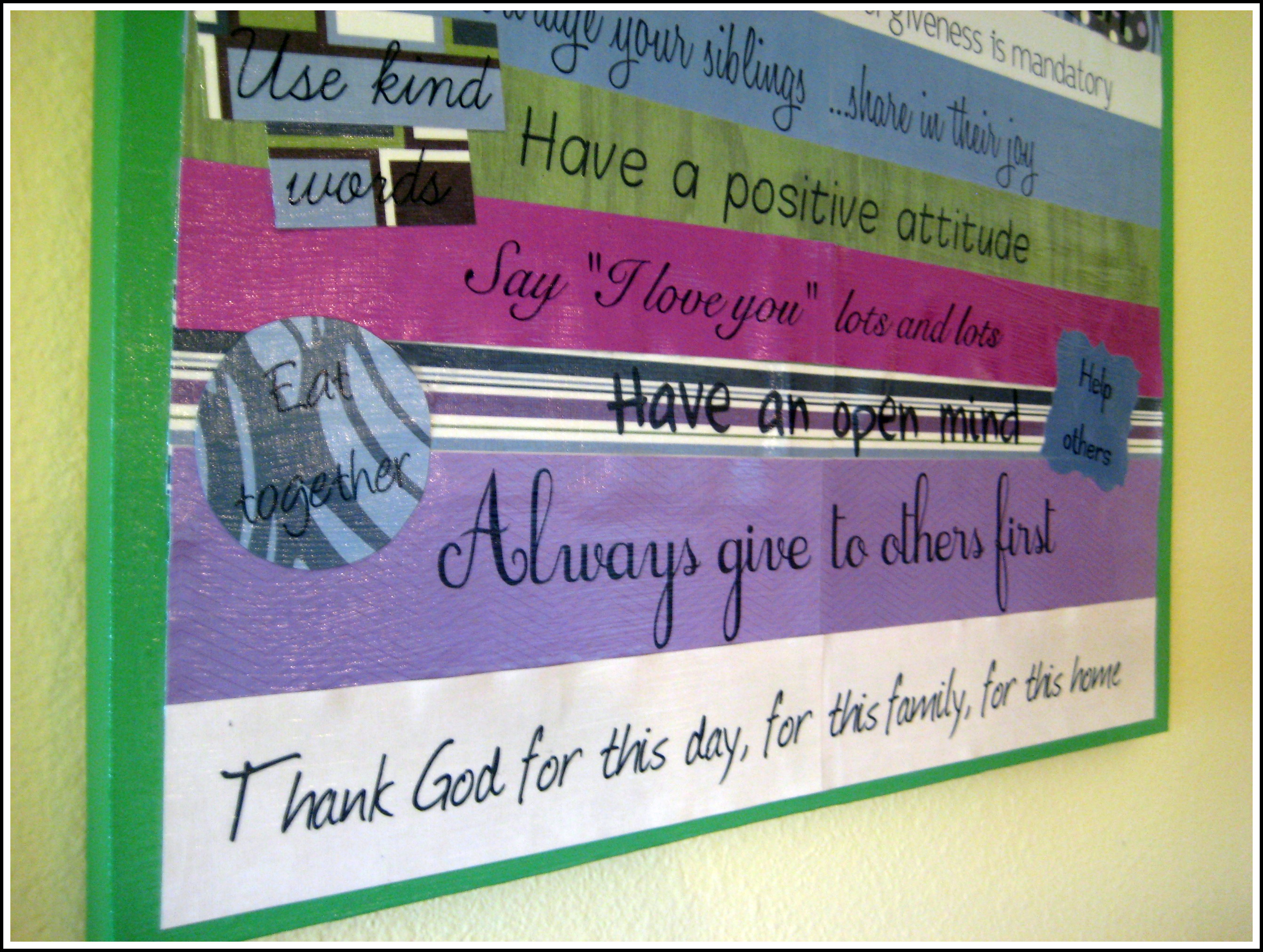 What I loved about this project, aside from the fact that I got to make this for someone I care about so much, was that I knew Jane would want something slightly different than my family rules. I welcomed the challenge. The one I made for our family is definitely my style- loud, colorful…a bit busy. They fit me and my family to a ‘T.’ And with the color scheme in our kitchen, they work. I love how they *pop* off the wall and people notice them when they come over for the first time. Jane has different decor than we do (she has a smokin’ 80s kitchen while ours is still smack-dab in the swanky 70s) and has always liked certain colors. I wanted to make her Family Rules “look like her,” and to go with her family and her home. I think I did a good job. She seems to like them, anyway. I need to get over to her house and take a picture because all of these photos are in my home.