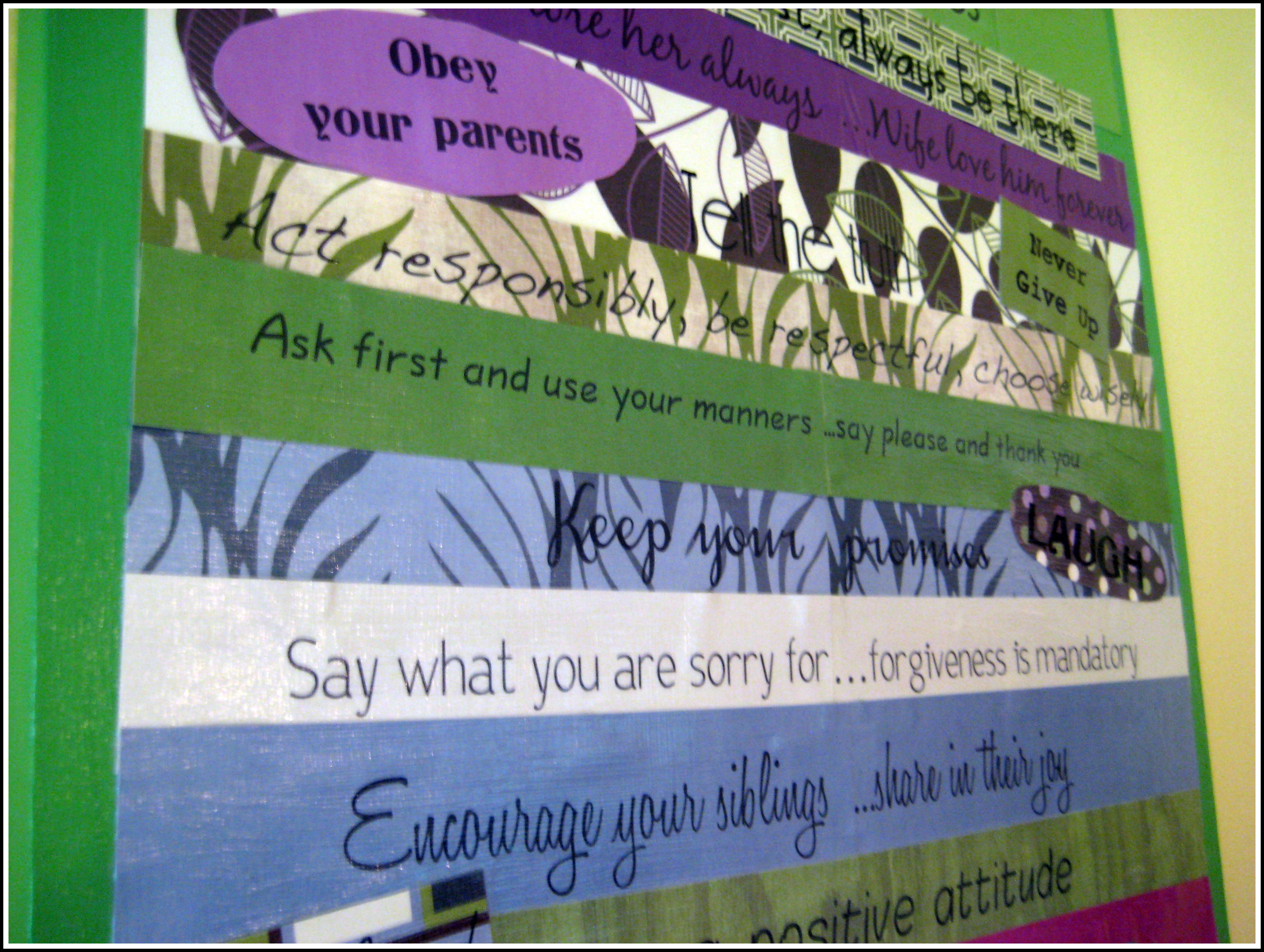 Yesterday I introduced you to my wonderful friend, Jane. Jane’s birthday is in May. It is now January. Why does that matter? Well, it was in May that I told Jane that I’d make her a set of family rules for her home. And just this past weekend I finally actually gave them to her! Granted, I did have a baby in July, and Jane did have to come up with the rules (a fun, but daunting task). Here they are in all of their Mod Podged glory (and please note: I REALLY need/want a new camera- ours is getting tired):