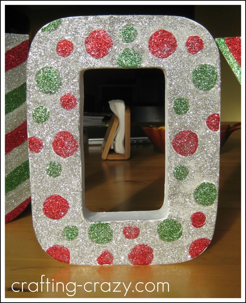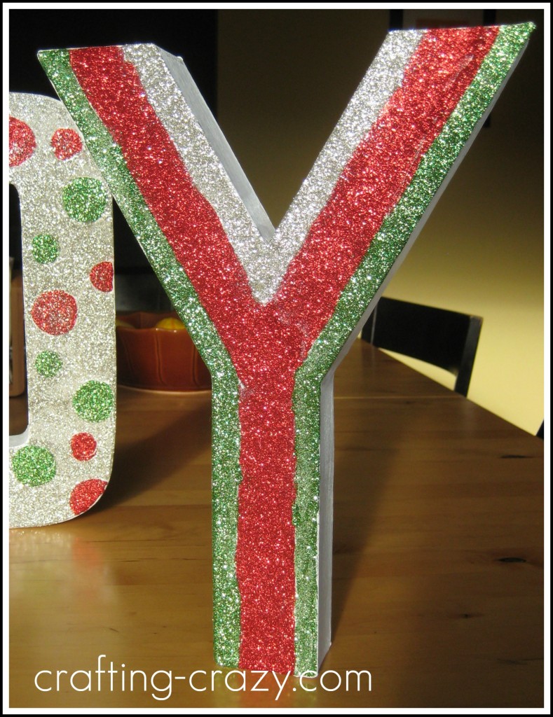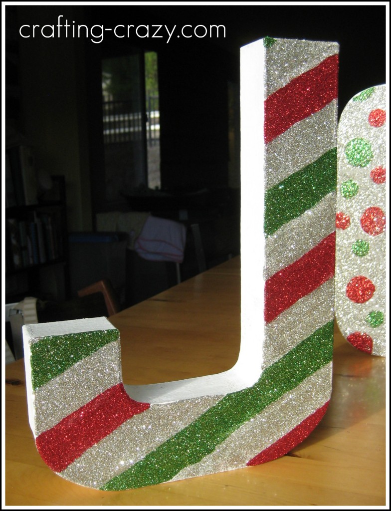 I think the most important thing about this is patience- waiting for the glue to dry. I used a rather thick coat of glue, and didn’t want it to run and mess up my design. So, for example, for the “J”, I did all of the silver stripes one day, and then the next I did the red and green. The hardest letter by far, was the “O.” Filling in all that silver around the dots took a lot of time, and it’s still not “perfect” but it’s cute.