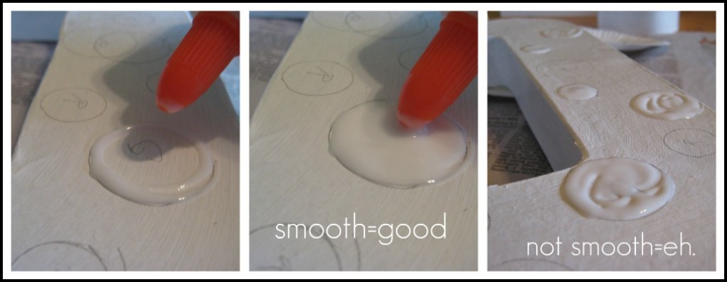 For the “O” I just used the tip of my glue bottle. First I outlined the circle, then I filled it in. I did find that if I was super careful with how smooth the glue was, the glitter adhered better. Circles like the one on the right did not turn out looking as nice and I had to fill them in.