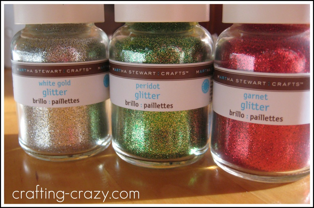 Now comes the fun part- the glitter! I decided, since I needed glitter anyway, to try Martha Stewart’s glitter line. It does not disappoint- it is so fine (as in tiny) and the colors are just beautiful. These are the three colors I used (white gold, peridot & garnet):