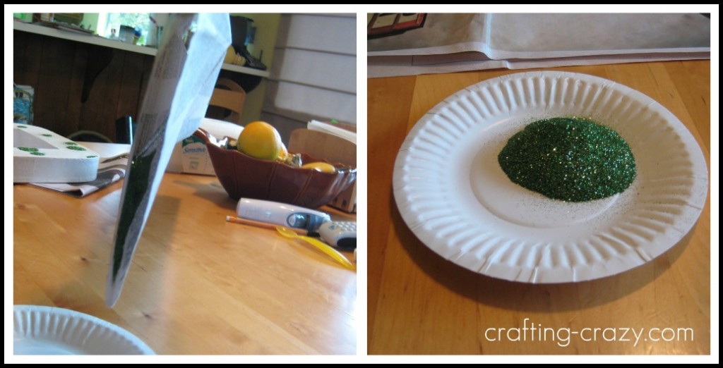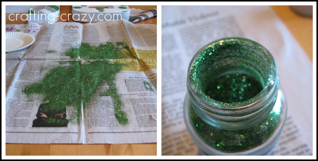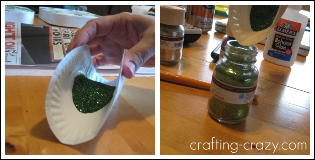 So here’s how to get all that excess glitter back in the bottle/jar. You’ll see below that after I did some green glitter I had a TON on the newspaper. And on the right, you’ll see that my green glitter jar is nearly half empty. This is where those cheap & flimsy paper plates come in.
