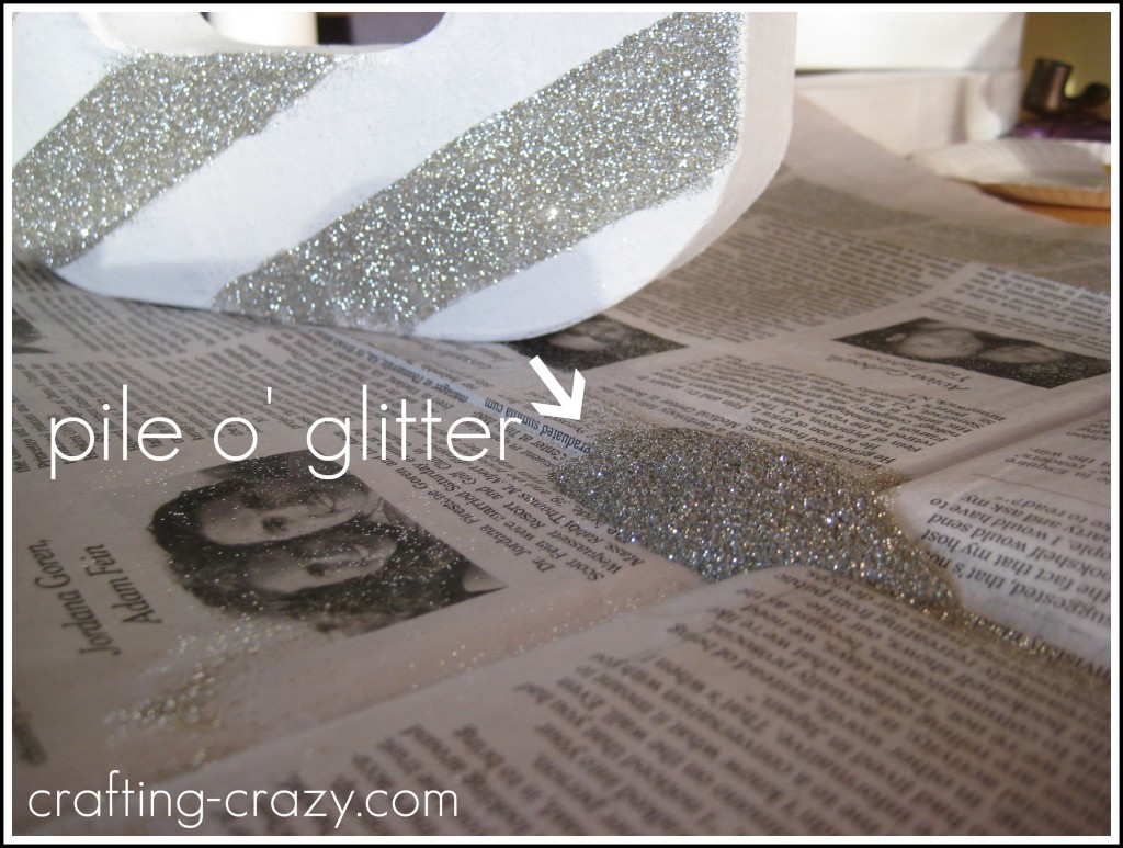 For the “J” I painted the glue on with a paint brush and did only one color at a time. So I did silver first since it was going to be every other stripe. I’d paint a stripe with glue, sprinkle on the glitter, and then tilt & tap to get the excess off. At first I used a spoon until I got used to it, but found that after a while the spoon was just an extra step.