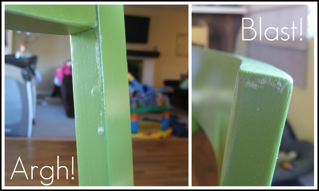 After letting the chairs dry for 24 hours, I coated them with one coat of Polycrylic (I used Minwax). I HATE that stuff. It was not fun to use at. All. I’m hoping it really does help because I was cussing inwardly a lot. It did give the green a nice sheen, as the finish of the paint was “Satin” and it wasn’t quite as glossy as I wanted. But you can see below that the chairs have bubbles in a few places. Oh well. I still love them.