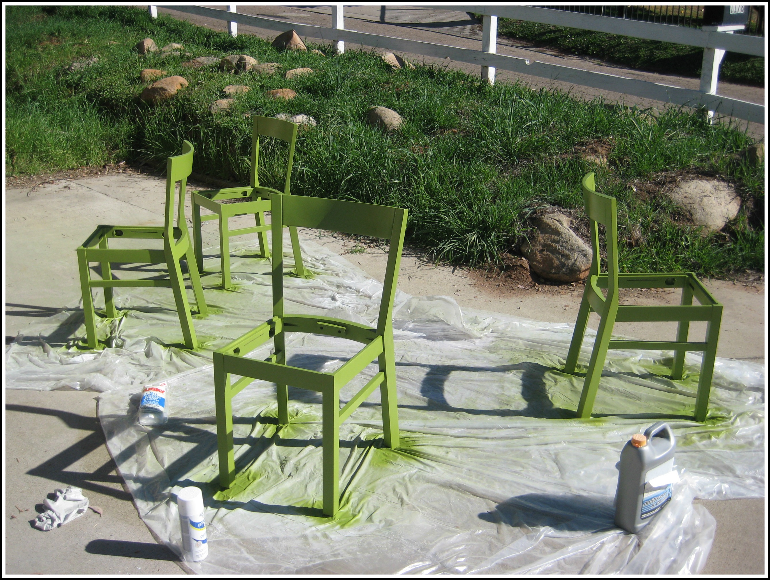 - I’ve never been entirely sure how long I had to wait between coats, but I had one morning to bust this out while Anna & Jack were in preschool from 8-12. So after reading the directions on the can, I came up with a plan. It took me about 20-25 minutes to do one coat on all 4 chairs, which is about how long the can said to wait. So I just worked my way around the chairs, checked my watch when one “round” was complete, and then moved on. I started at 9:30 and finished at 11:45. I will say this: it was VERY hot the day I did this and the sun was VERY bright. This actually made it harder to see any missed spots when I went from white primer to green.