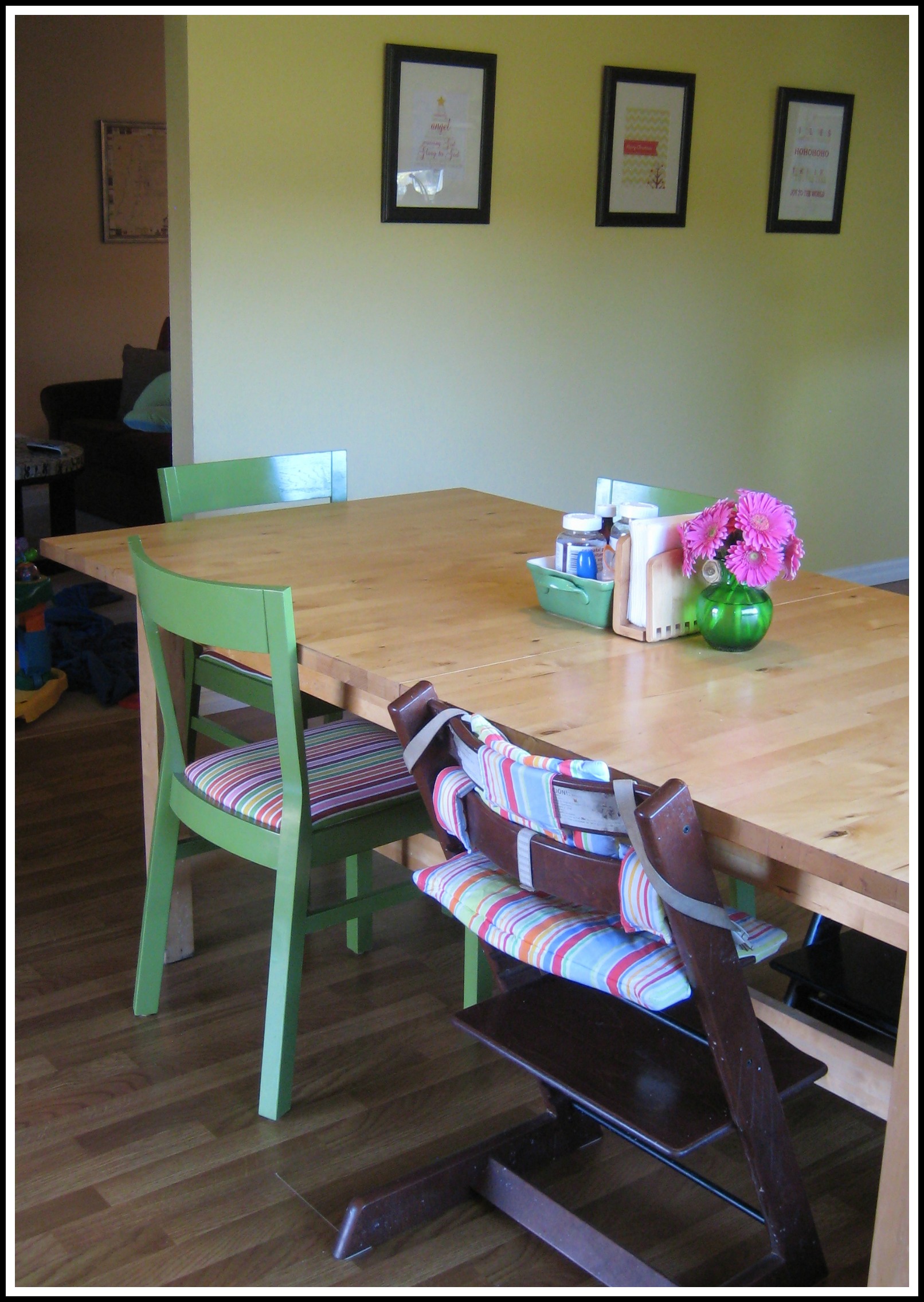 They totally don’t match. We used to have a dark table that they matched, but that table is long gone. Now we have a huge birch table (love it) and the dark chairs just do. Not. Match.